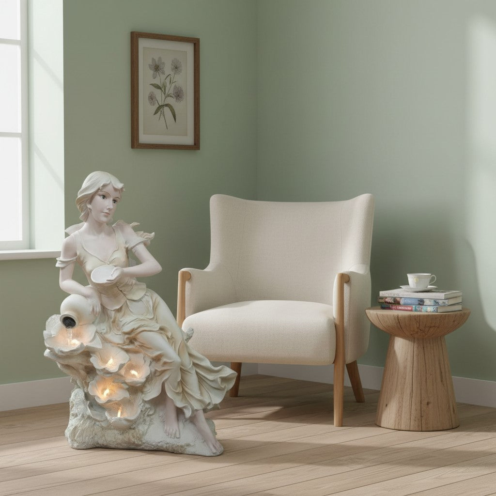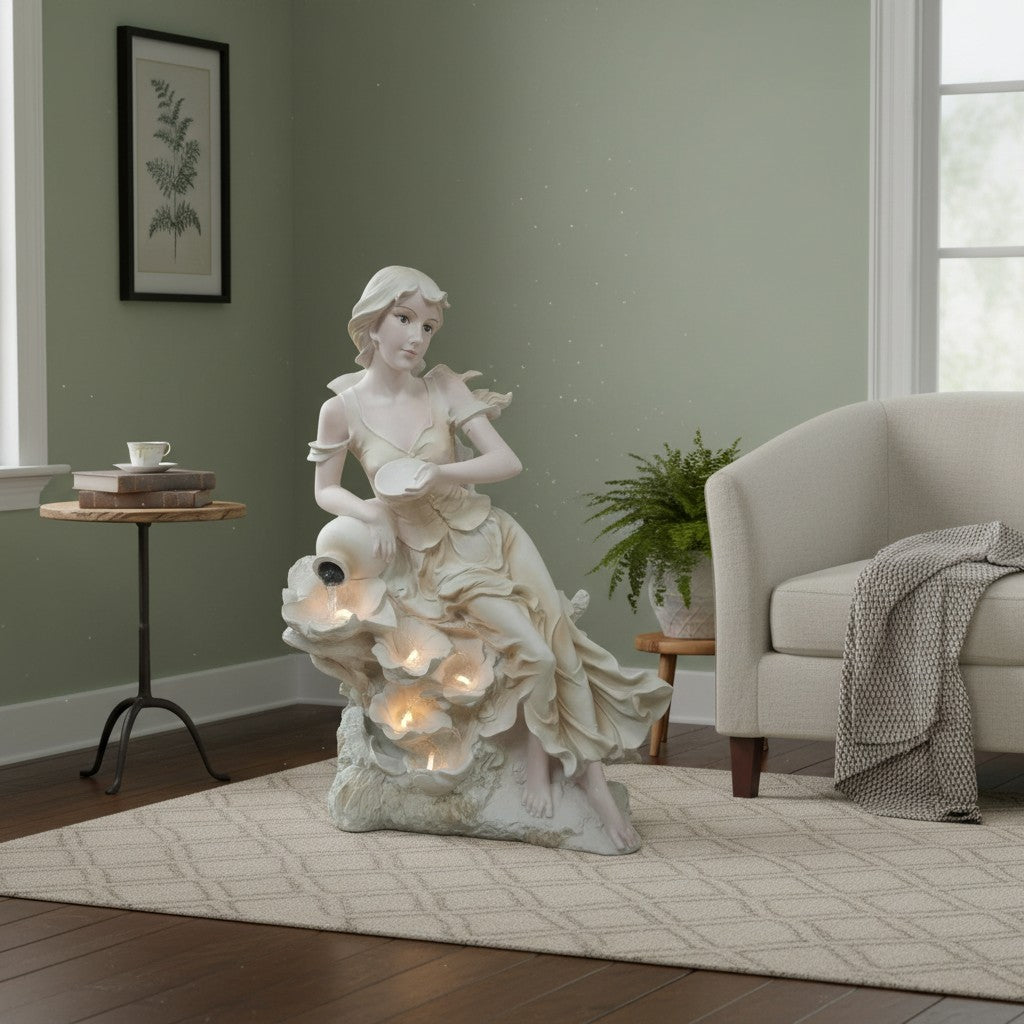 A graceful lady sculpture pouring water into layered flower bowls creates a dreamy, romantic aesthetic for any space.